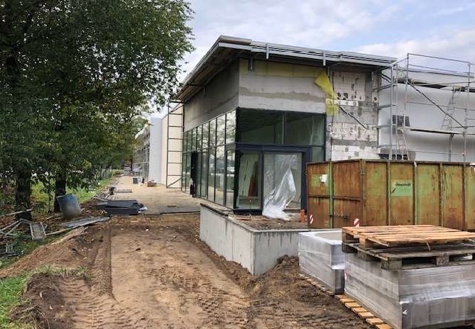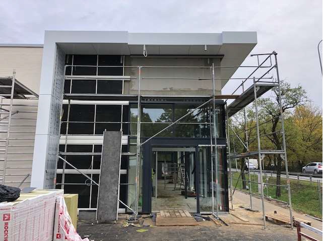 – budowa budynku usługowego w rzucie parteru w kształcie litery L składający się z dwóch prostokątów o wymiarach około 25 m x 37,7 m i 19,7 x 15,2 m; budynek został wykonany w konstrukcji halowej ze słupami żelbetowymi utwierdzonymi w fundamentach i przykryty stalowymi dźwigarami kratownicowymi.